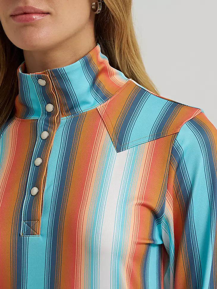 Saddle up in effortless style with the Wrangler® Skye Performance Pullover. Designed to keep you comfortable, it's made from a moisture-wicking, quick-drying fabric with built-in stretch and UV protection, shielding you from the sun’s harmful rays and moving with you whether you’re riding, roaming, or relaxing. It’s the details that make a difference, including a bold print bringing vintage flair to any outfit. The mock-neck design and partial snap placket let you adjust your look for style and warmth whenever you need. Perfect for layering, this pullover blends practicality with cowgirl personality—so you can stay cozy without sacrificing your signature look.