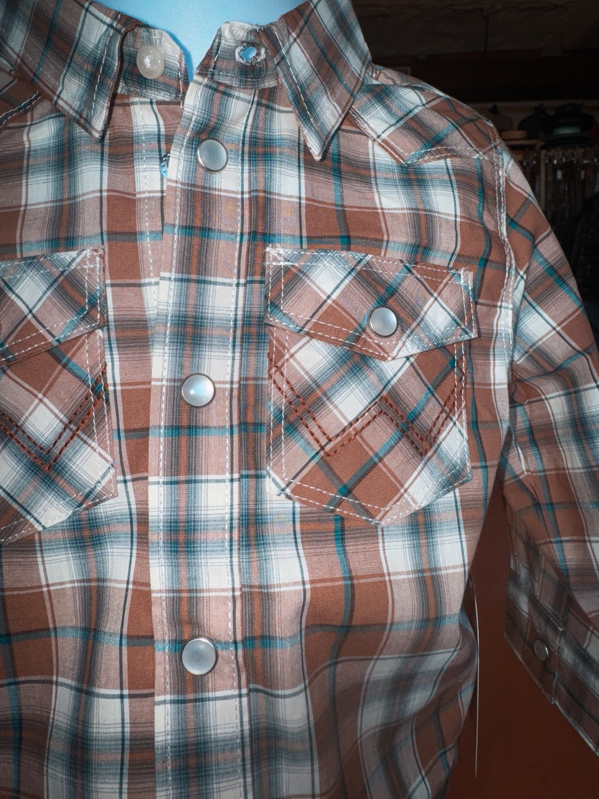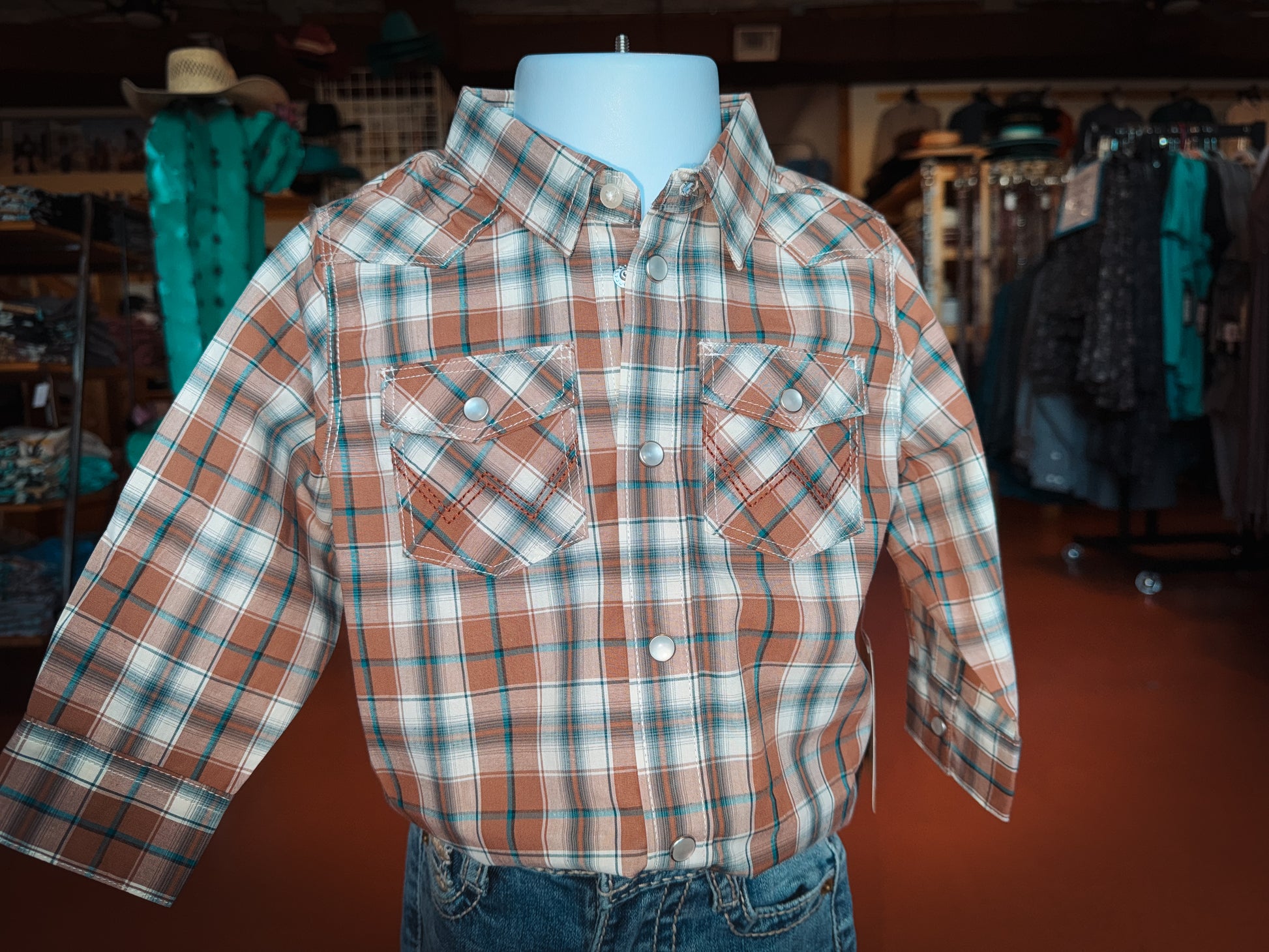 Get your little one ready for any occasion with the Wrangler Baby Boy Plaid Pearlsnap shirt! This toddler-sized, long sleeve shirt features a stylish brown, white and blue plaid design that will have your child standing out in the crowd. The pearl snap button-up adds a touch of class to this comfortable and versatile shirt.