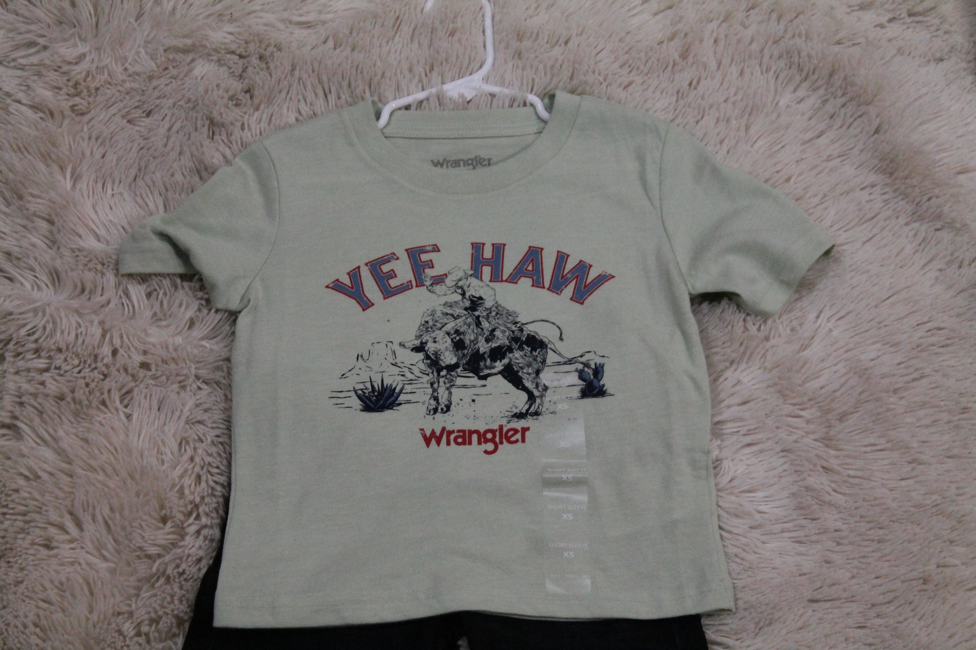 This Wrangler Boys Yeehaw Bull Ride Tee features a light green base and a bold bull rider image in the center. Crafted by Wrangler, this tee offers a fun and stylish way for your little one to show off their love for the rodeo. Perfect for everyday wear, this tee combines comfort and style for the ultimate wearability.
