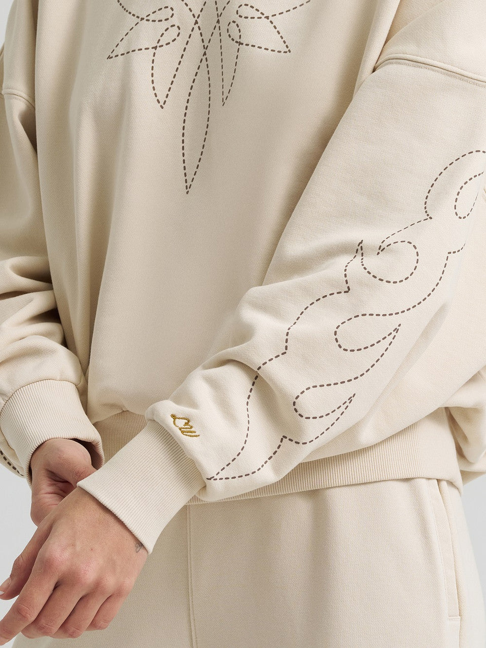 The Wrangler Lainey Wilson Sweatshirt in cream features distinctive boot embroidery, integrating a unique design element that enhances visual appeal. This sweatshirt offers comfort and style, suitable for various casual occasions. Its fabric composition ensures durability while providing a soft feel against the skin.