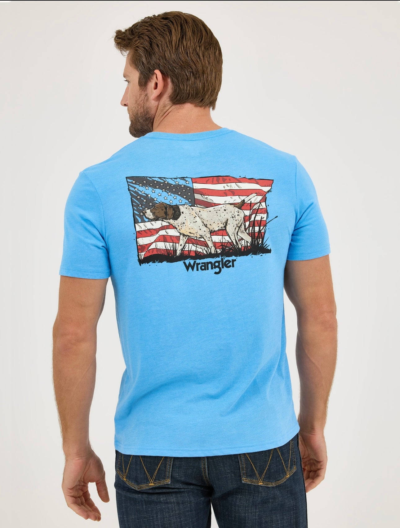 Be a true patriot with Wrangler's American Dog Tee. Featuring a sky blue base color and a bold black Wrangler logo in the front, this short sleeve tee also showcases a Texas flag and a dog on the back. Show off your love for America and man's best friend in this stylish and comfortable tee.