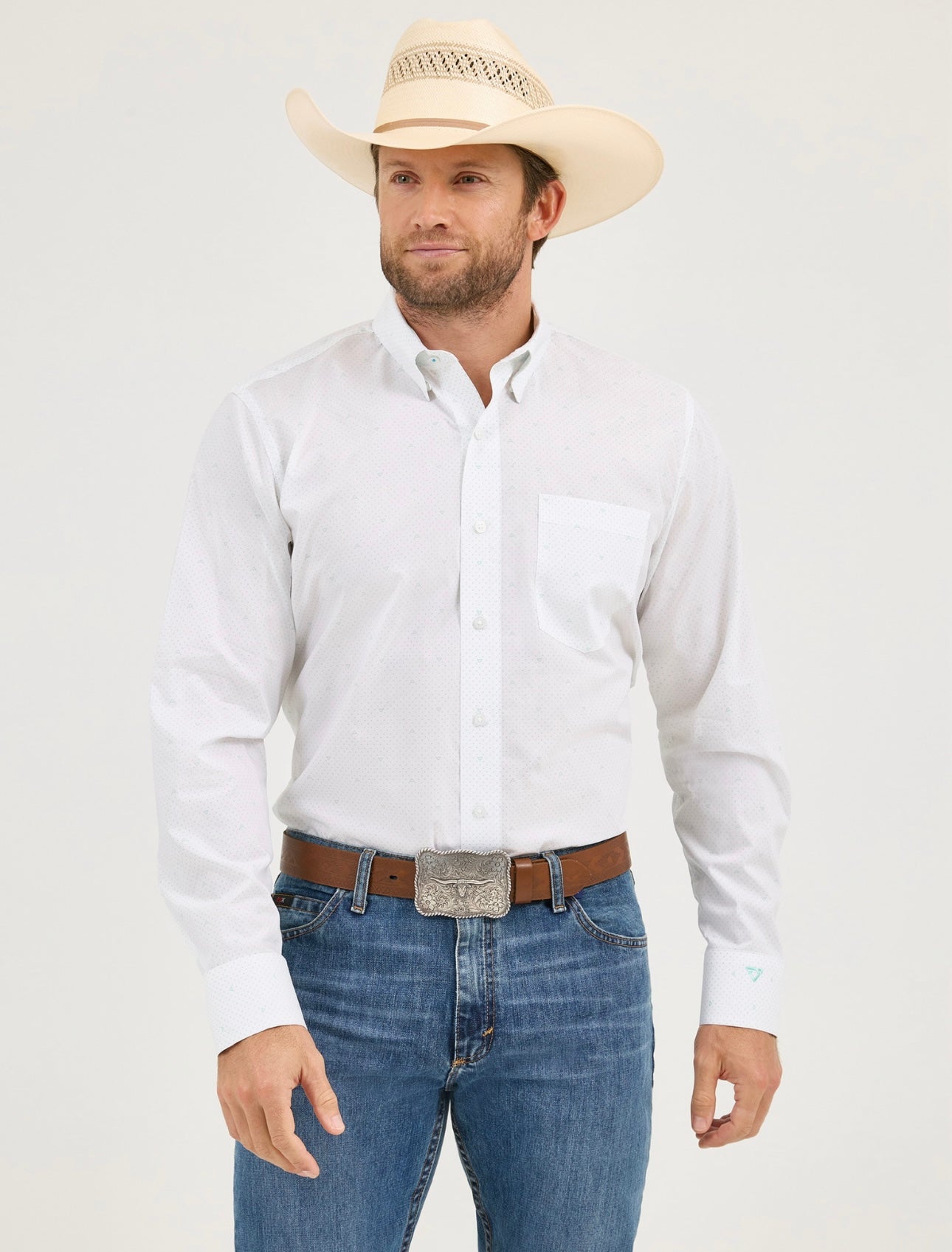 Featuring a classic wrangler design, our men's long sleeve button-up shirt is perfect for any occasion. The clear buttons add a modern touch to the white base color, while the aqua blue dots and cojo logos add a pop of color. Complete with one front pocket for added convenience.