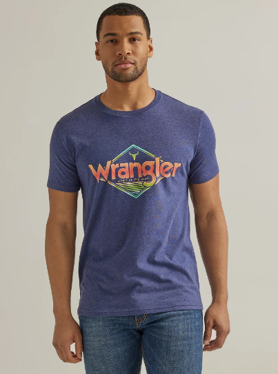 Wrangler Men's Denim Blue & Tangerine Sunrise Logo Graphic Short Sleeve T-Shirt
