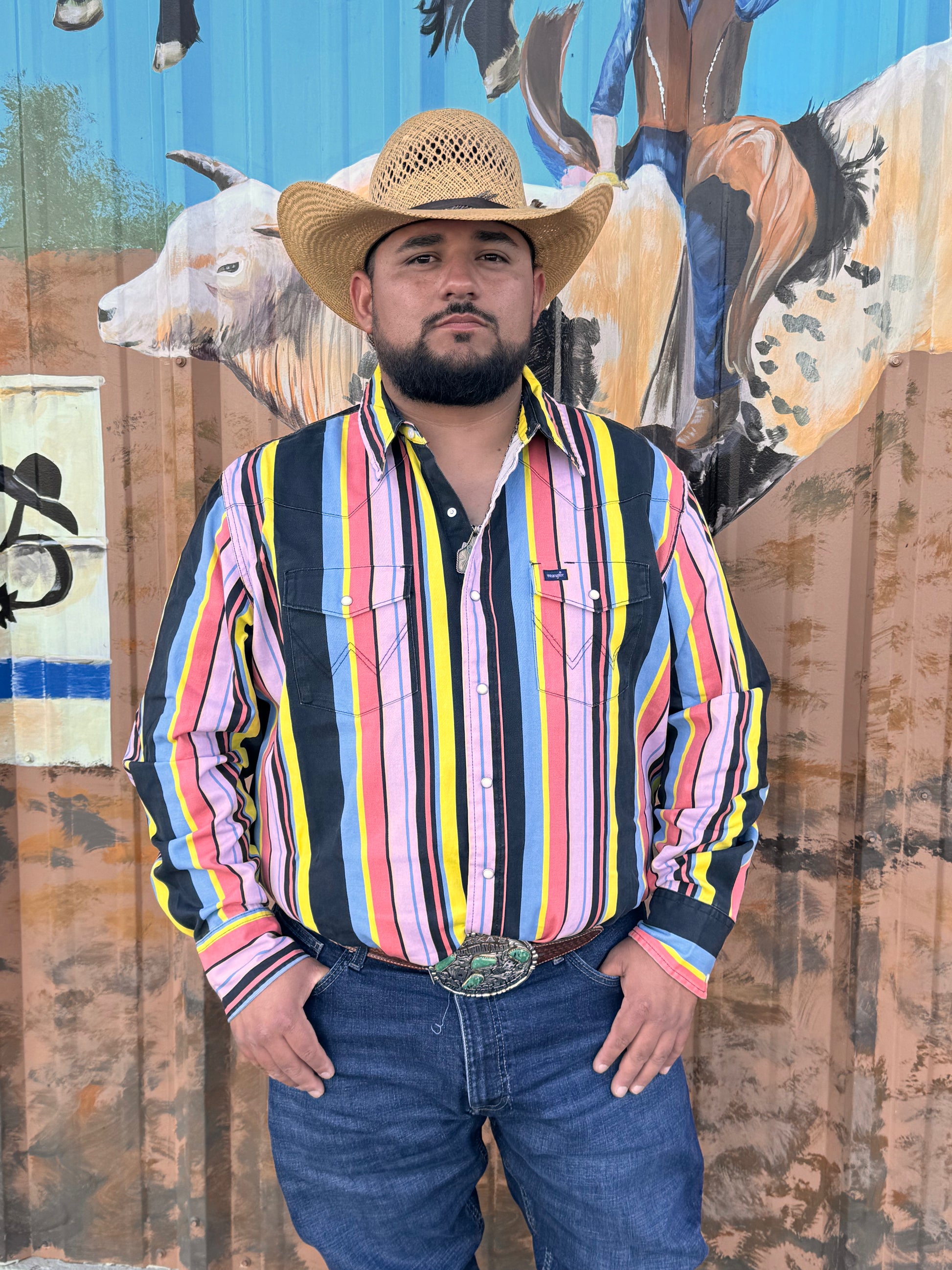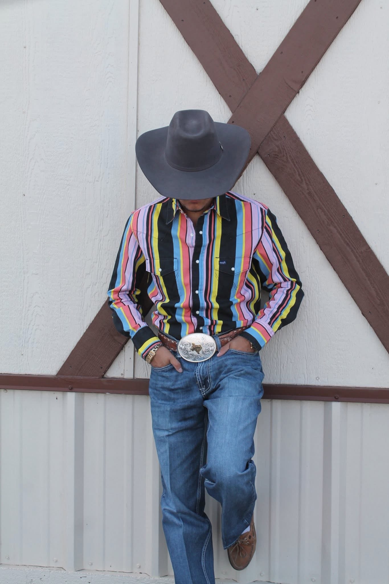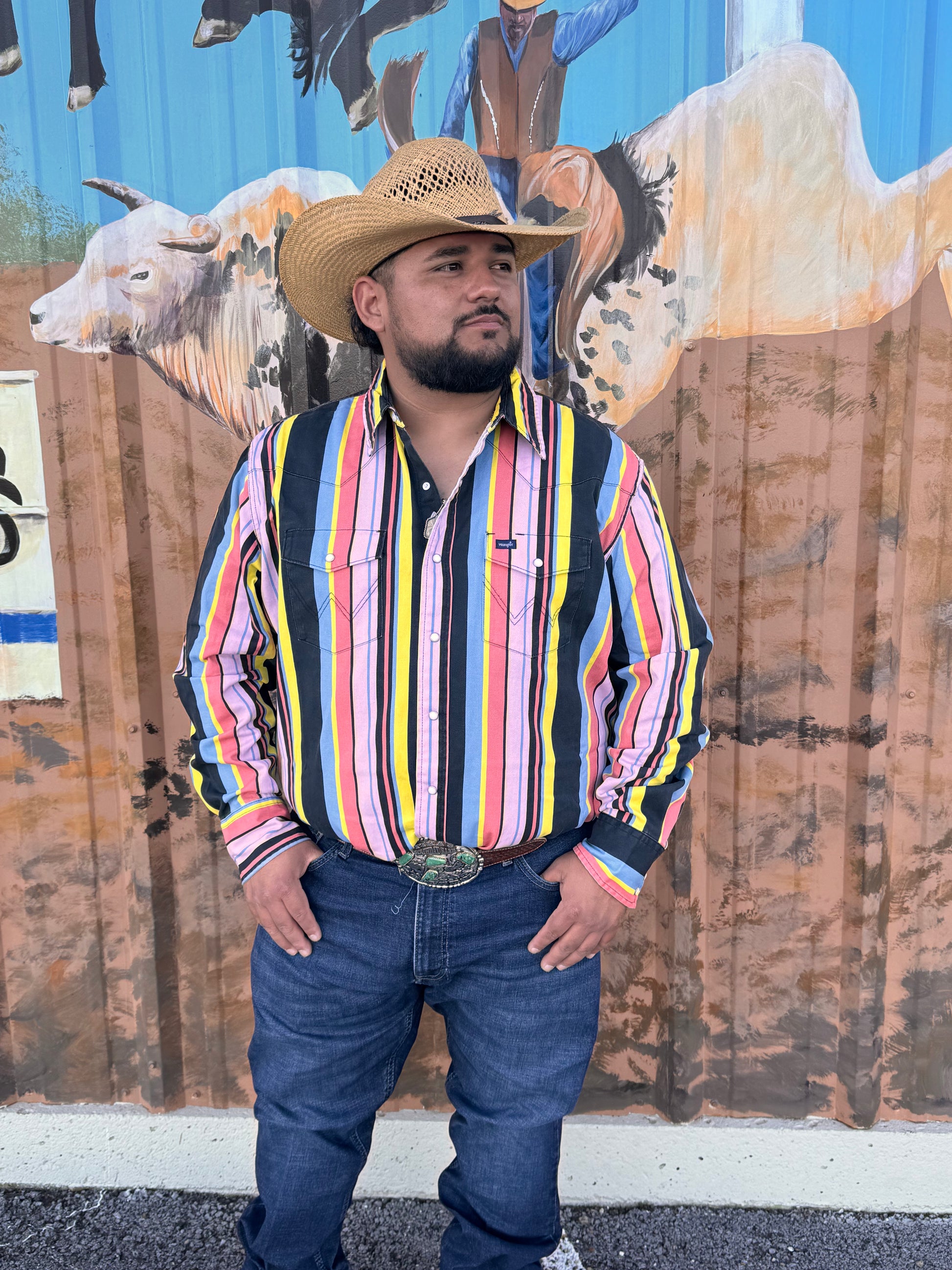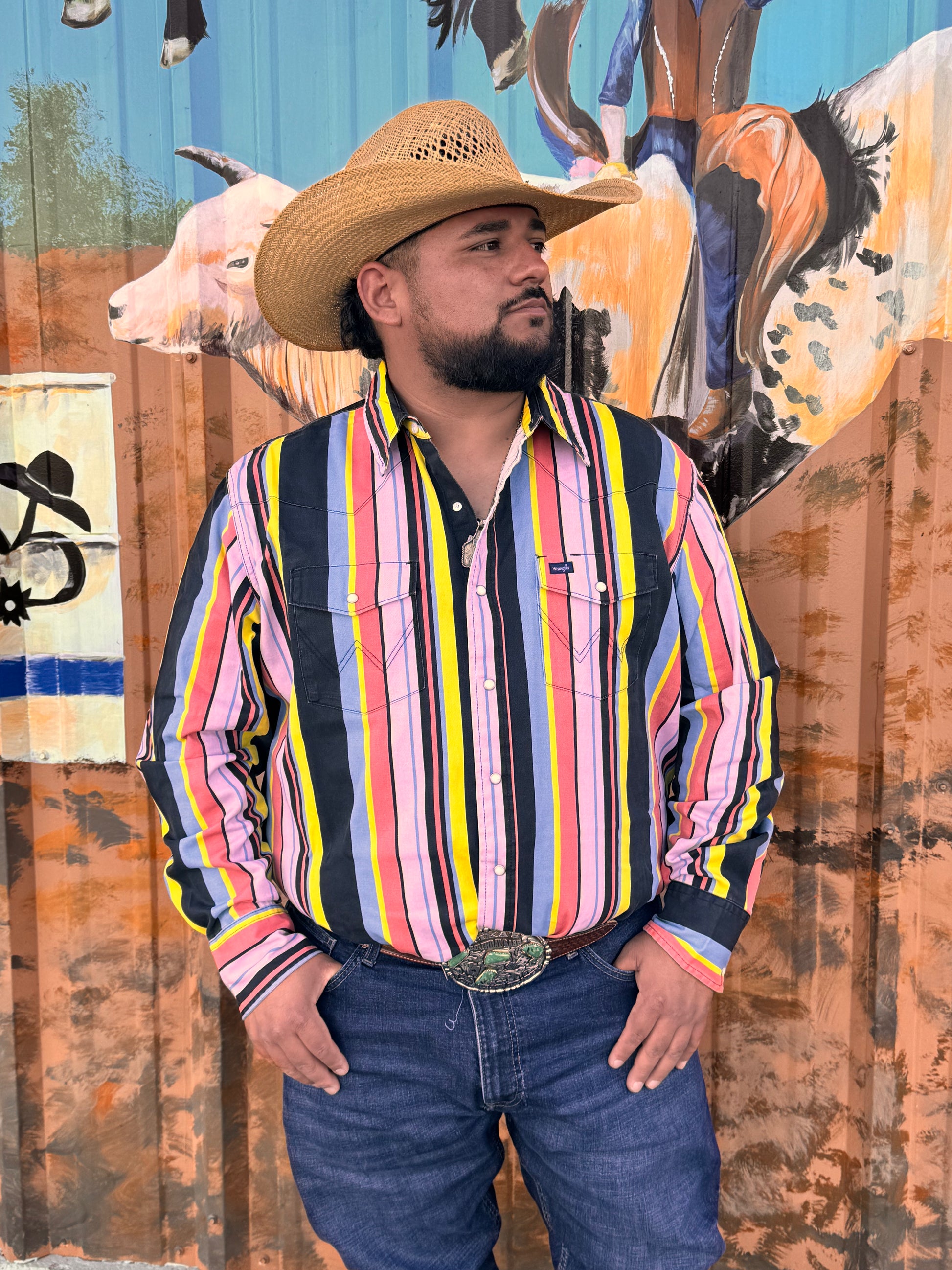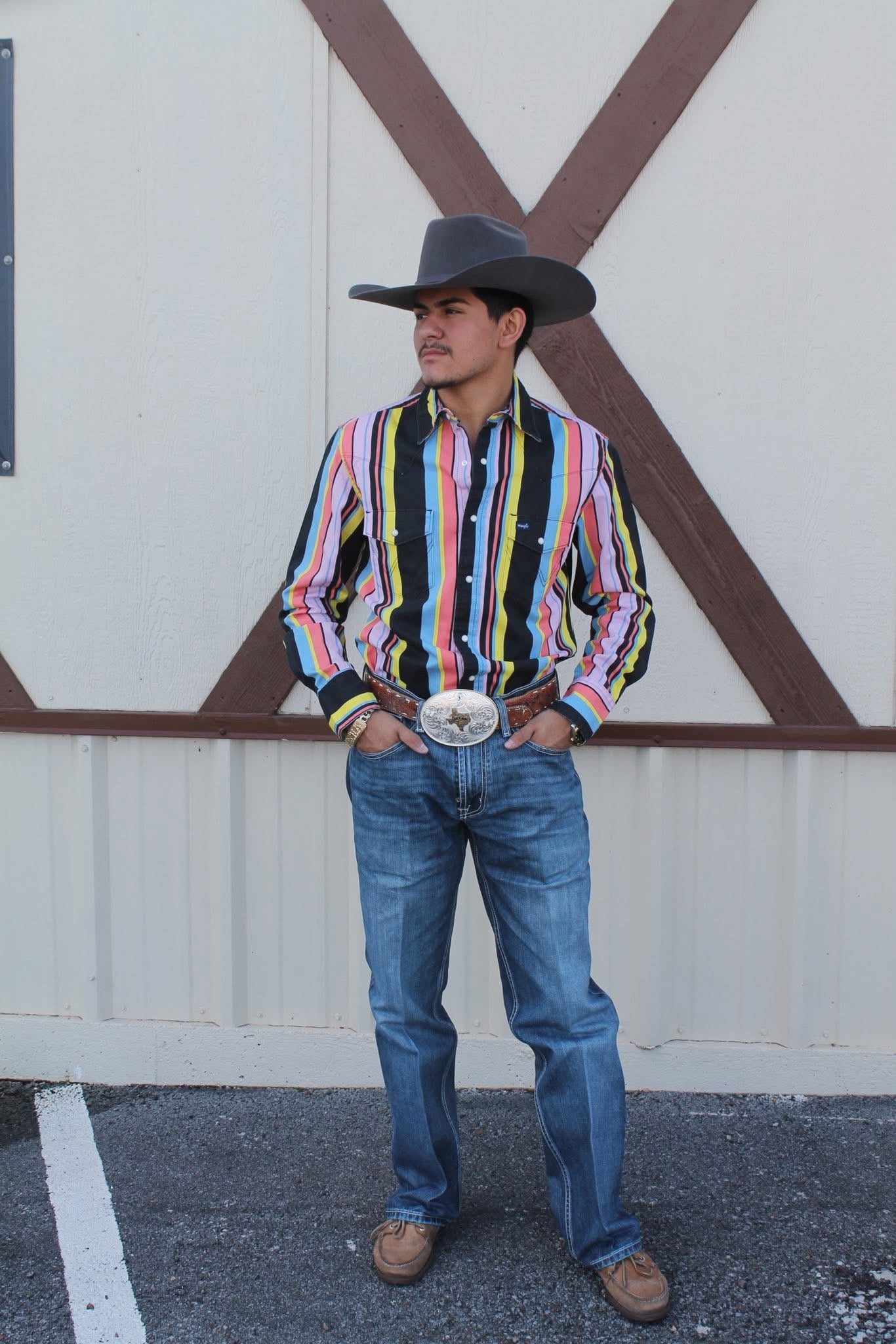 This Wrangler Men's Vintage Inspired Black Multi Snap Shirt is a timeless addition to any wardrobe. With its distinct Western style yoke and pockets, this black shirt features multicolor stripe prints and snap flap chest pockets. Made from 100% cotton, it also has adjustable cuffs and a spread collar for a classic fit.