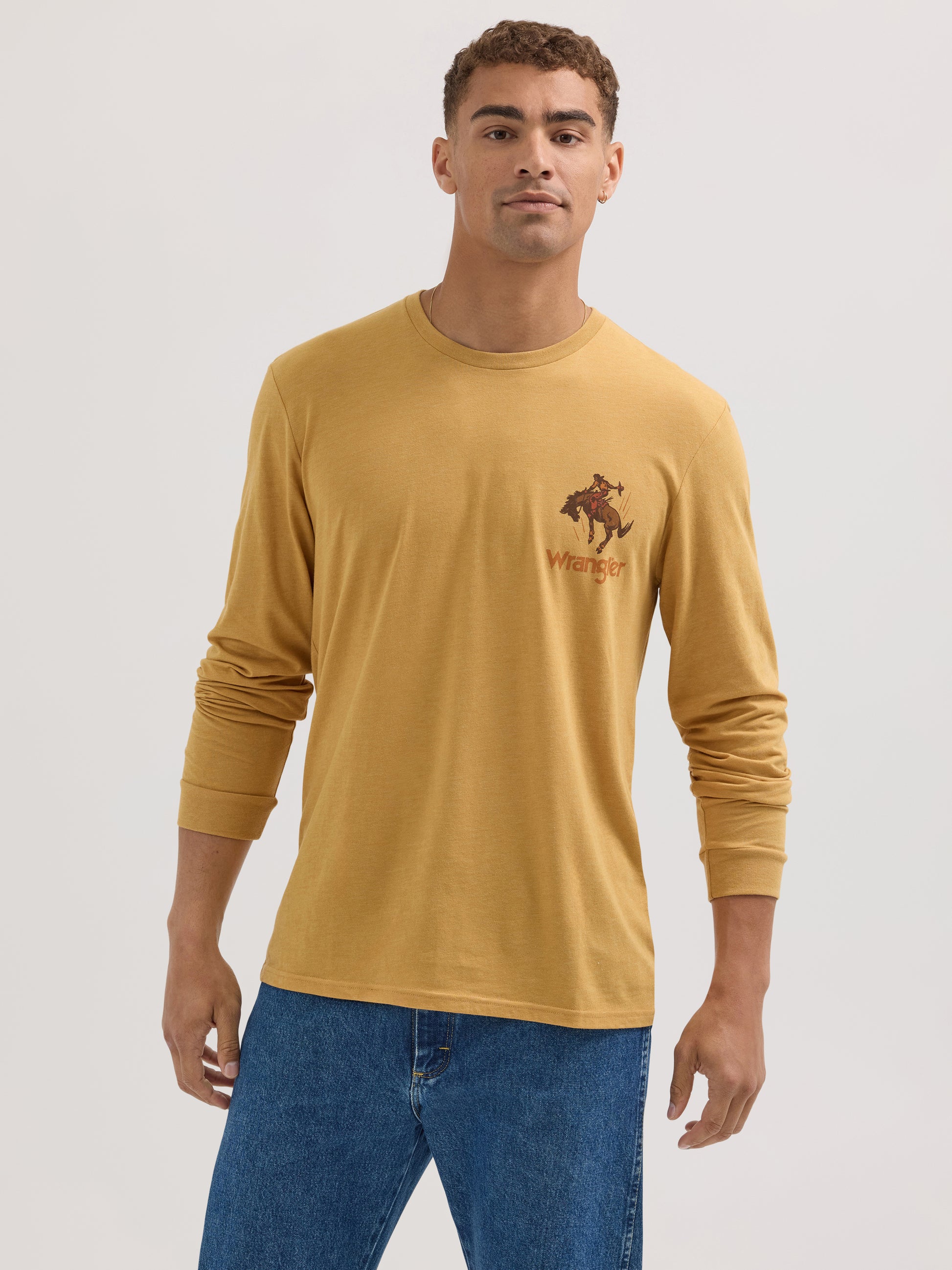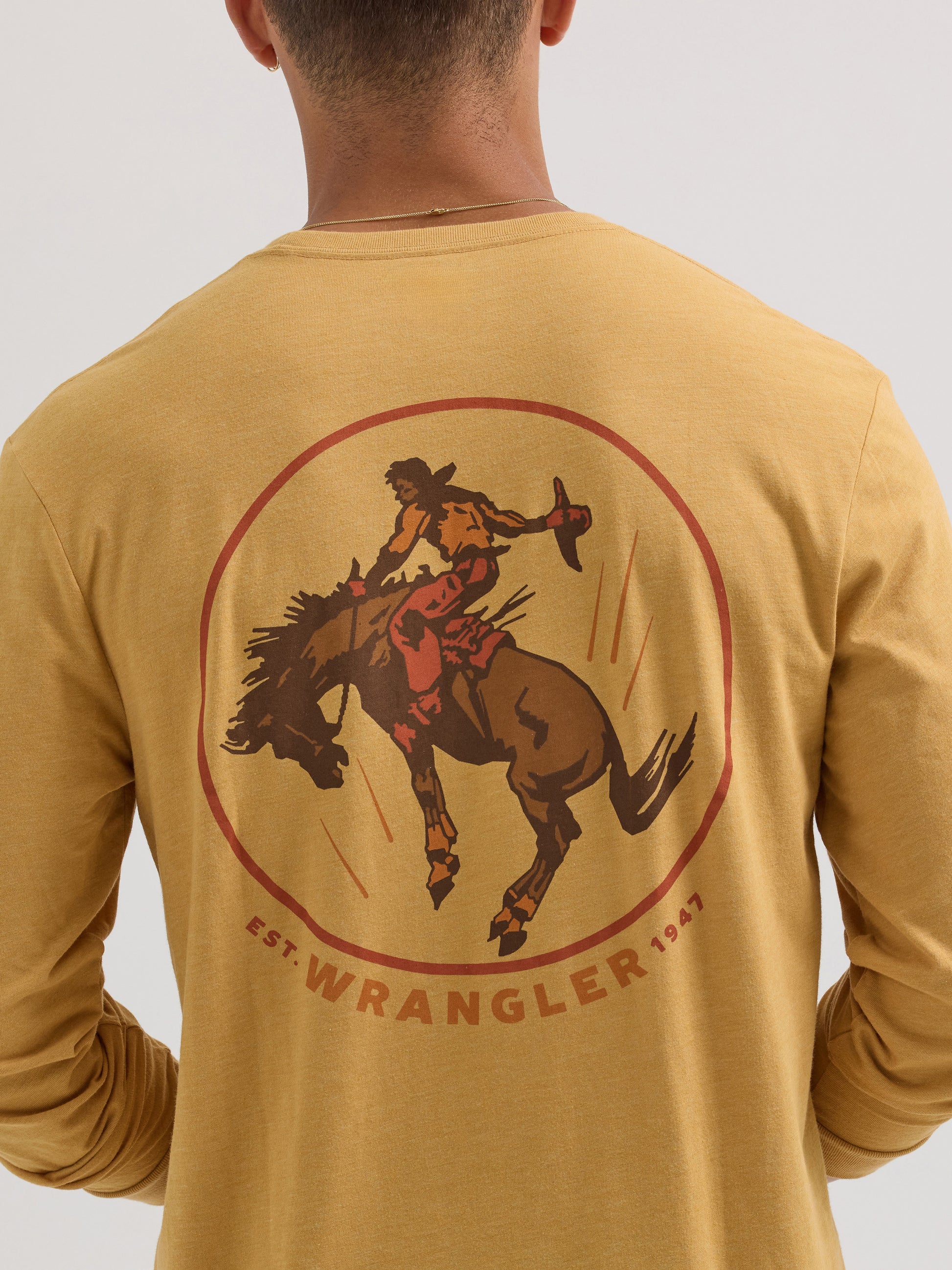 This unisex Wrangler Ride LS Tee features a bold mustard color, perfect for standing out in any crowd. With a bronc rider graphic on the back and a small front pocket, this shirt is both stylish and functional. Show your love for the rodeo with this eye-catching tee.