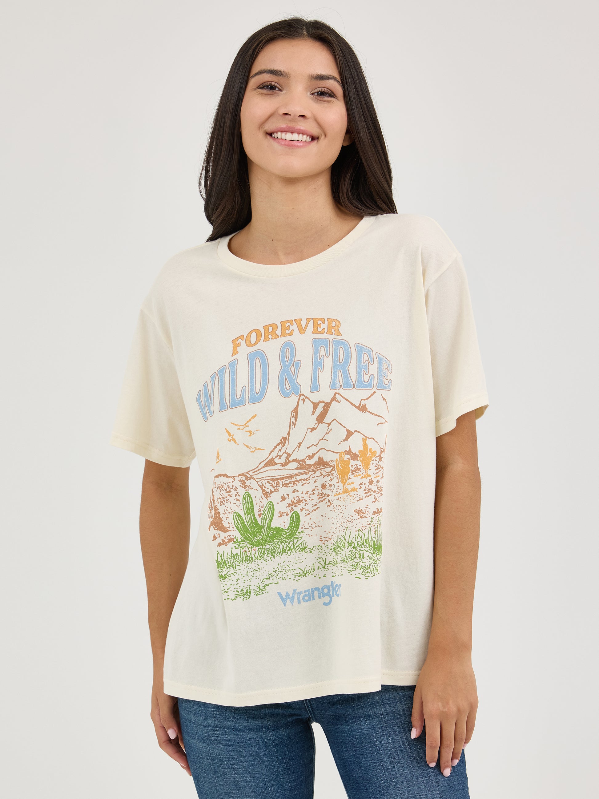 The Wrangler Women Forever Desert Girlfriend Tee is a must-have for any fashion-forward woman. Its comfortable fit and stylish design featuring a mountain image and "forever wild&free" slogan make it perfect for everyday wear. Made by Wrangler, known for their quality and durability, this tee is sure to become a wardrobe staple.