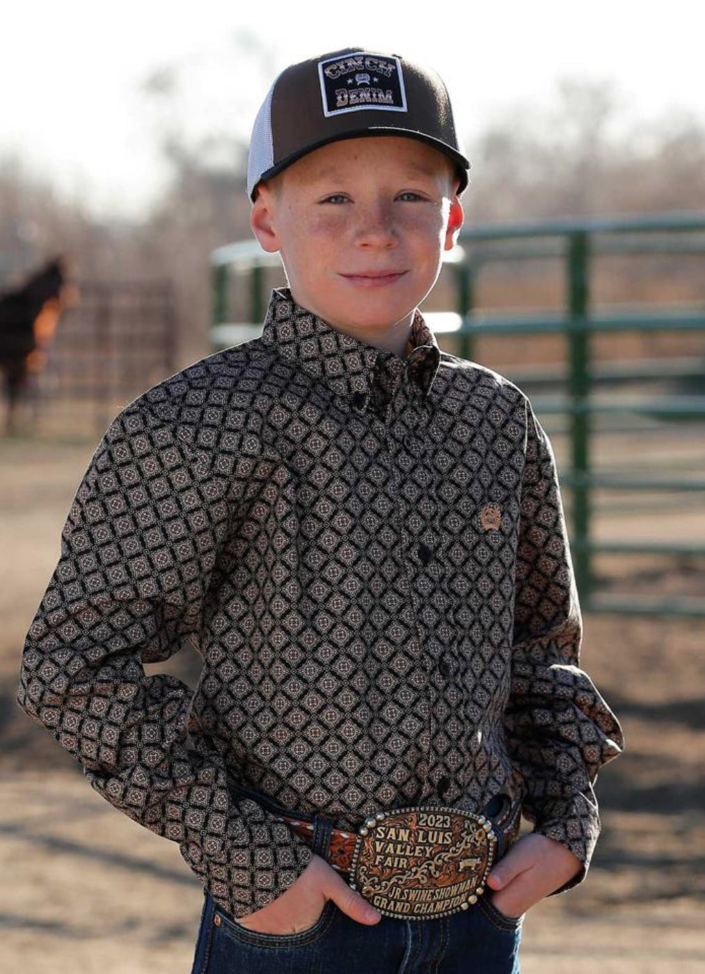 Expertly crafted and stylish, the Youth Cinch Brown and Black Long Sleeve is perfect for any western fashion enthusiast. With a front pocket and regular black buttons, this shirt exudes a sleek and modern look while also maintaining a touch of classic style. The combination of black, brown, and white creates a versatile and timeless piece that will elevate any wardrobe.